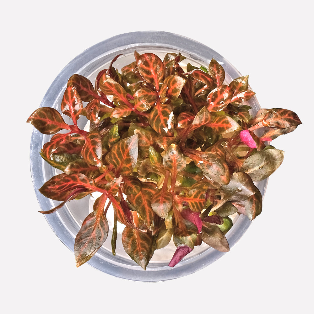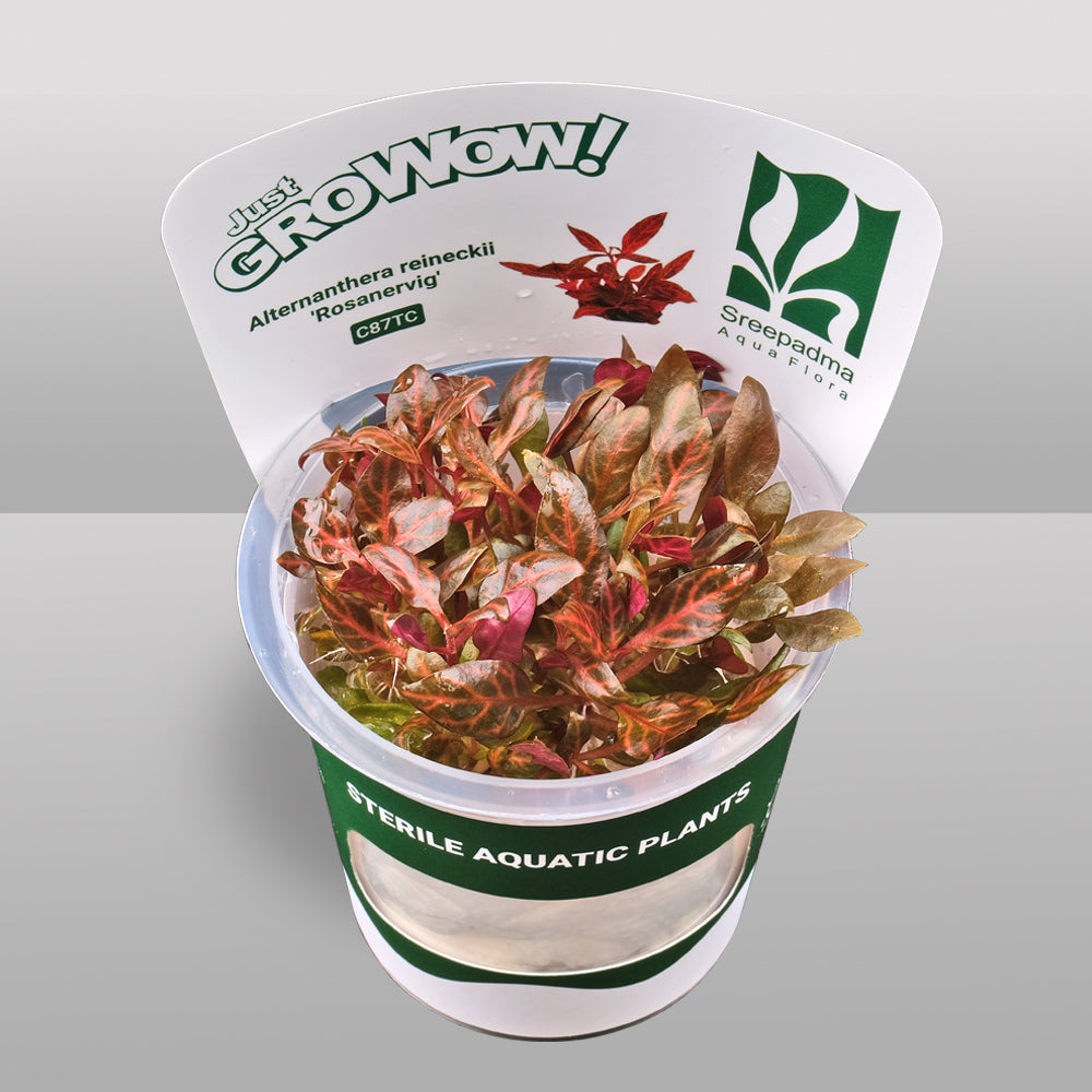 Alternanthera reineckii ‘Rosanervig’ is a striking stem plant known for its vibrant pink to magenta leaves accentuated by prominent light-colored venation, which gives it high ornamental value in aquascaping. This cultivar exhibits a moderate growth rate and, like others in the Alternanthera genus, requires high light intensity (≥50 µmol/m²/s) and consistent CO₂ supplementation to achieve optimal coloration and compact growth. A nutrient-rich substrate combined with regular dosing of macronutrients (NPK) and micronutrients, particularly iron (Fe), is crucial for healthy development and to prevent fading of its signature pigmentation. Unlike some hardier varieties, A. reineckii ‘Rosanervig’ has a softer, more delicate stem structure, making it more sensitive to handling and pruning stress; care should be taken during planting or trimming to avoid stem damage. It is best positioned as a background plant in nano or small aquariums, where its height and color create a dramatic focal point, or as a midground feature in larger tanks for added depth and contrast. Under optimal submersed growth conditions, it can reach heights of 20–30 cm (8–12 inches), with bushier formation achievable through regular apical trimming. Propagation is typical of stem plants: cuttings from healthy tops or side shoots can be replanted directly into the substrate.