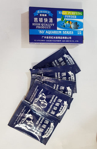 BD magic purifier Powder can purify water quickly after asdding the powder in fresh or saline water in aquarium, beacause it makes anions and cations bound in water but it deos nort hurt aquatic plants and animals. You may not change water after adding this powder at least one month.